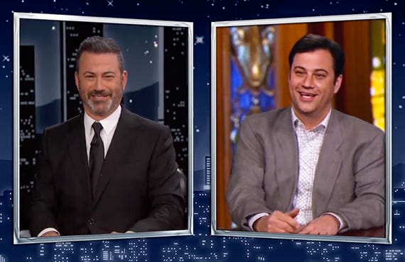 Jimmy Kimmel celebrates his 20th anniversary by speaking with his 2003 self and dunking on his critics